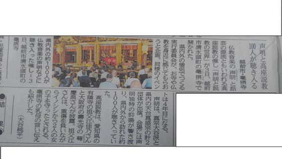 2017/07/04 11:15昨日、声明と説教の世界が無事円成しました。福井新聞に掲載されました。 暑いくらいの気候となりましたが、たくさんの方に参拝していただきありがとうございました。司会のマイクの音声がところどころ途切れる部分がありました。 また、熱中症予防のため本堂の扉を開ける音なども記録されるかもしれませんが、ご承知おきいただけるとありがたいです。 当日は3台のカメラによる撮影をしました。編集と音質調整を行いひとつの作品に仕上げていきます。ご支援ありがとうございました。目標額に達成したとはいえ、製作費用を全て賄っているわけではありません。まだまだご支援募集中です。お知り合いの方にも声明・説教のDVDご案内くださいませ。 もっと見るsuccess感謝! リターンを新たに設定しました。