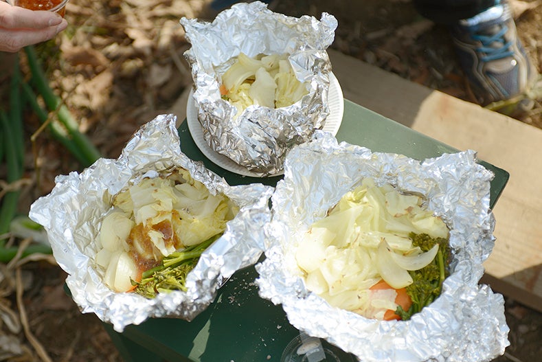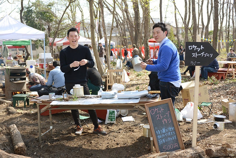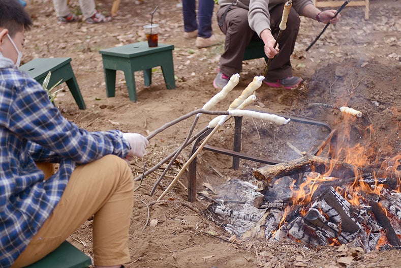 来た人は雑木林の中で、ゆったりとコーヒーを飲んだり、おしゃべりしたり、焚き火にあたったりしてすごします。なかでも、北本野菜のグリルや、枝に巻きつけた焚き火のパン焼きなど、やはりおいしいものは大人気です。