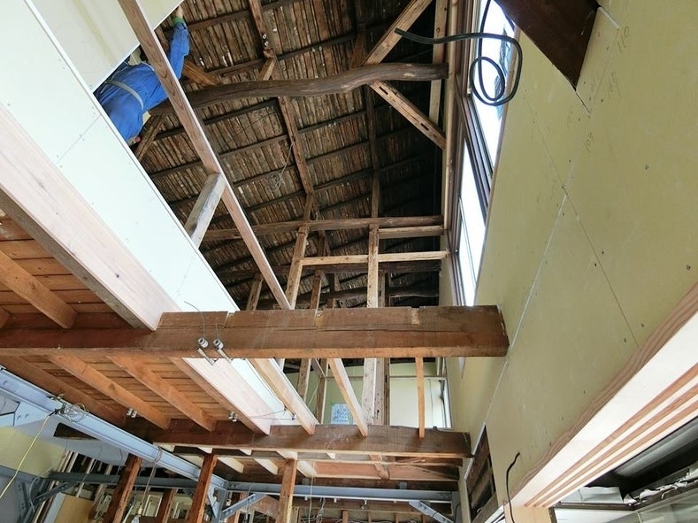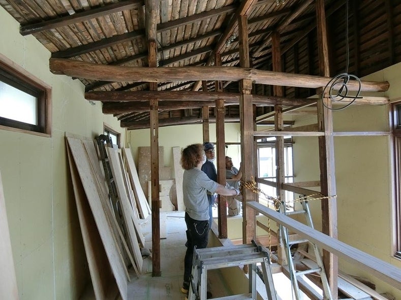 DIYでの解体からはじまったリノベーション工事は驚きの連続です。壁を壊したと思ったら古い壁が現れ、剥がせばさらに土壁が現れ…二階では屋根を支える部材に近隣の小学校のはるか昔の建替え工事で譲り受けた木材がリユースされ…物語に事欠きません。建物の歴史を感じます。