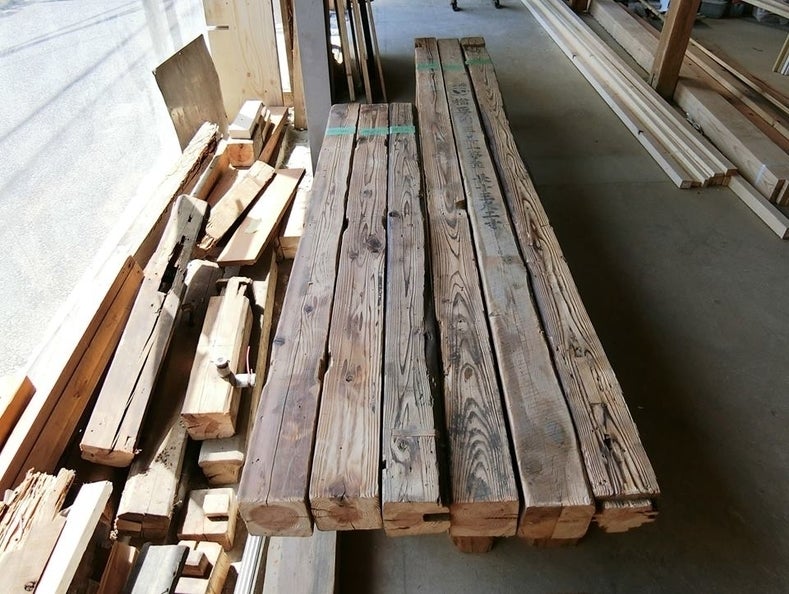 <建物を鉄骨で補強した後、外した柱はベンチとして再利用しました。店先に並ぶ予定です。>