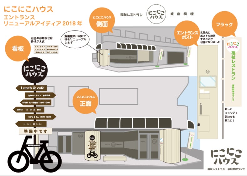 お店は車通りの多い道から一本入った路地にあるマンションの1階部分に立地しています。手作りの看板に営業時間や一部のメニューを表示していますが、マンションの外観は無機質で私たちがどんな活動をしているかをイメージしにくいものとなっています。事実、来店される方の中にもお店の場所がわかりにくい、何のお店かわかならいという声があるのが現状です。