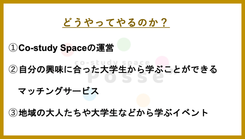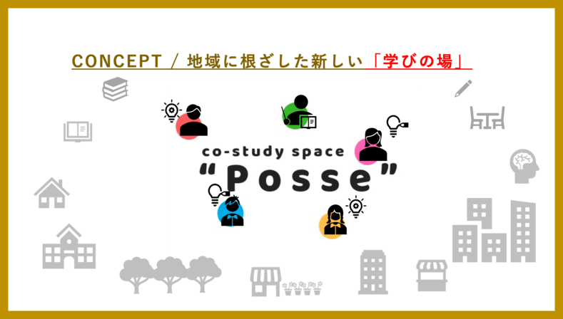 今回のプロジェクト、Co-study space “Posse"のコンセプトは、地域に根ざした第3の「学びの場」を作るというものです。