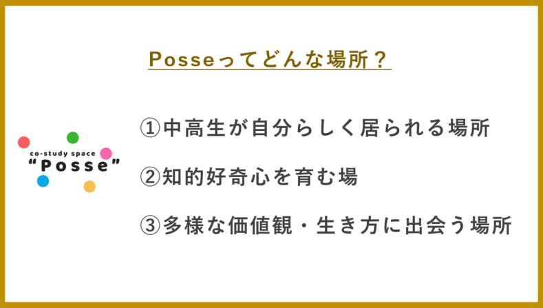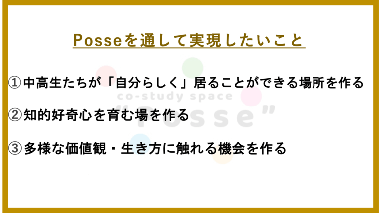 Posseは中高生のサードプレイスとして、子どもや生徒としての役割から一旦離れ、自分自身と向き合いながら心地よく過ごせる場を提供していきます。