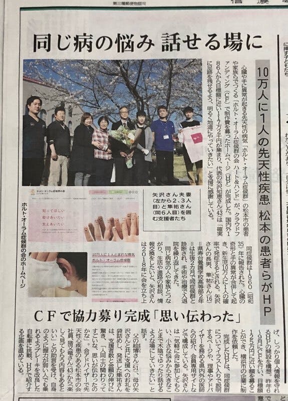 2021/04/07 09:05「新聞にこのホームページが掲載されました!」いつもご支援をいただきありがとうございます。桜も散り始めてしまいましたが皆様にはお変わりありませんか?2021年4月7日付の「信濃毎日新聞」にこの会、このホームページについて掲載されました。 写真は理事やアドバイザーの有志の皆さんも一緒です。 右から・アドバイザー 平塚 滉脩さん ・理事 瀧聞 浄宏さん ・副代表 安河内 聰さん ・代表補佐 丸山 昌子さん (代表家族) ・アドバイザー 沼田 隆佑さん 改めてこのクラウドファンディングにご支援して下さいました皆様に感謝申し上げます。 このホームページを最大限活用して、この病気の認知を高め、患者様のお力になれる様に理事やアドバイザーと手をたずさえ研鑽を積んで参ります。 どうかこれからもご支援・ご協力をよろしくお願い申し上げます。 このホームページについて取材・掲載してくださった信濃毎日新聞さまに御礼申し上げます。 2021年4月7日水曜日 ホルト・オーラム症候群 ハート&ハンド 代表 矢沢 知恵より もっと見る新しいホームページができあがりました!!