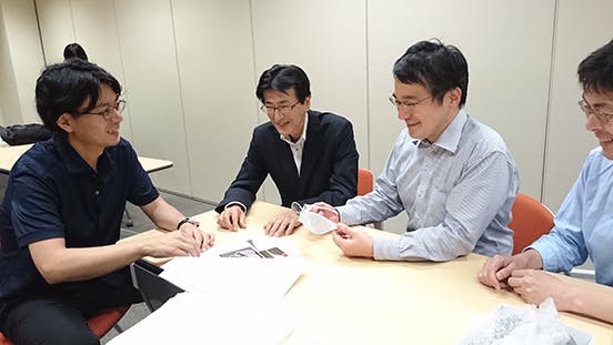 ↑打ちあわせの様子。左から、安藤氏、弊社担当マネージャー佐藤、越前教授、片方氏