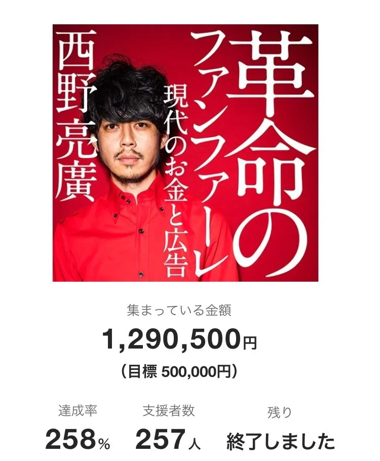 西野さん自身のクラウドファンディングで講演会の権利が発売されました。