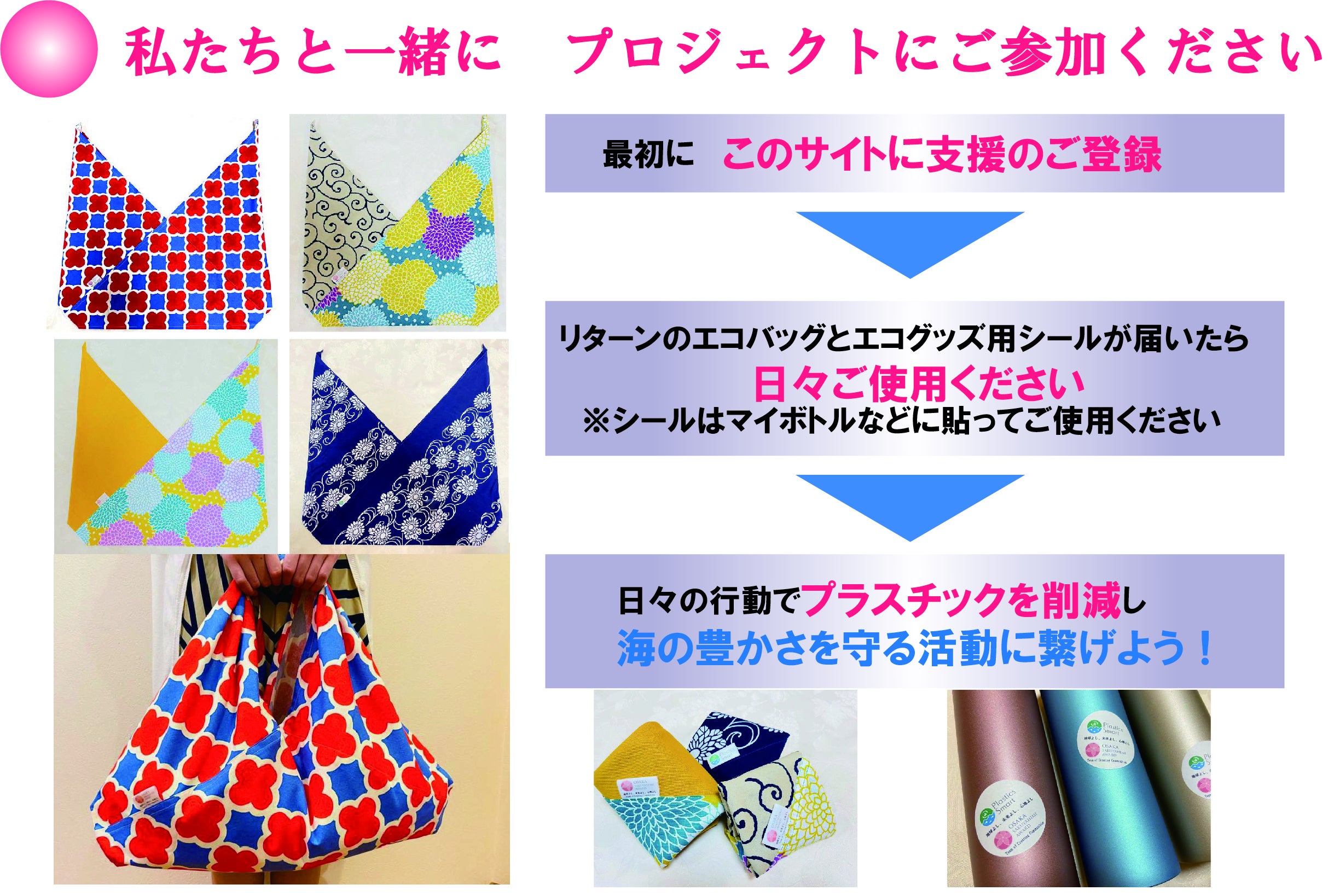 今回のプロジェクトは、使わなくなった端布を活用してエコバッグを製作することからスタートします。コロナ禍で経済活動が制限されるなか、認定NPO法人トゥギャザーさんとの連携で、大阪府内の福祉作業所で製作。コロナ禍中でのお仕事を創出します。またエコバッグには、プラスチック削減に気づきを発信するロゴマークをつけています。支援していただく皆様にエコバッグを使っていただくことで、地域の方々にも取り組みを発信いただき、海の豊かさを守る活動に繋げていきましょう。