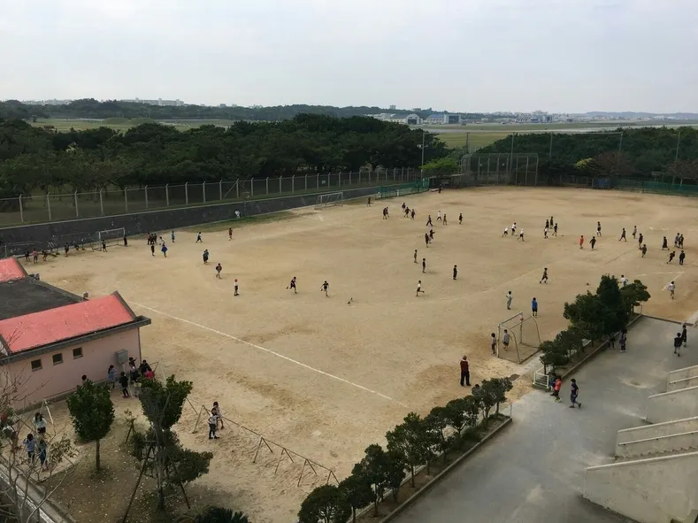 宜野湾市立普天間第二小学校は、宜野湾市の北、国道58号線と国道330号線を結ぶ県道81号線の中ほどにあります。学校の北側には普天間三叉路があり、その周辺に普天間神宮や商店街などが立ち並んでいます。南側は米軍普天間飛行場とフェンス越しに向かい合っています。そのため、輸送機、ヘリコプターの騒音にさらされているといえます。 普天間第二小学校の建設は、宜野湾村が市になった1962(昭和37)年ごろから人口が増え、中心地の普天間小学校の児童数も限界に近づいていたことから計画され、1969(昭和44)年に分離開校しました。 現在の校舎は1996(平成8)年に完成した新校舎で、オープン教室となっています。児童数は707人で、5つのスポーツ少年団(野球やバスケット、バレーボール、サッカー部、音楽部)がとても盛んです。
