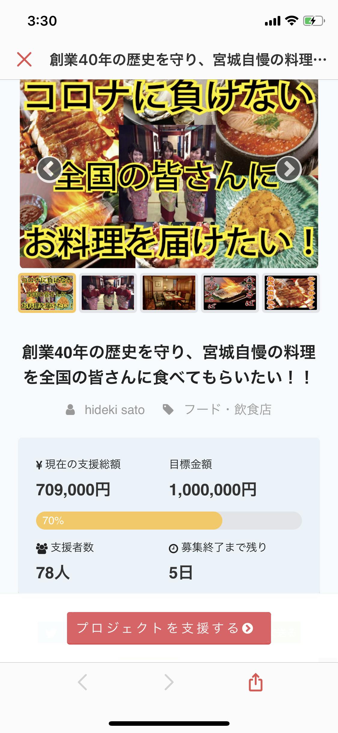 2020/07/25 17:41皆様の温かいご支援で目標の70%を達成する事ができました。誠にありがとうございます。目標達成まで頑張っていきたいと思います。店舗も少しずつお客様が戻ってきていましたがまた、感染報道がある度に日に日に減ってきている状態でございます。本当に先の見えない状況ですが、ネガティブにならずに来ていただいたお客様に精一杯喜んでいただけるように、毎日笑顔で仕事をしております。お礼の品ですが今月末のプロジェクト終了後に皆様の個人情報が当社に届き次第追ってご連絡させていますので、もうしばらくお待ち下さい。 もっと見る現在64%です。