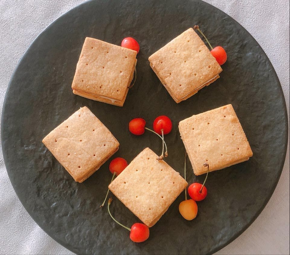 採れたての佐藤錦を使った自家製ジャムを、クリームチーズベースのフィリングにとじこめ、さらにきび糖で作った優しい甘みのサブレで挟みました。