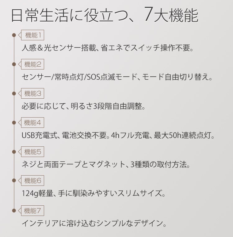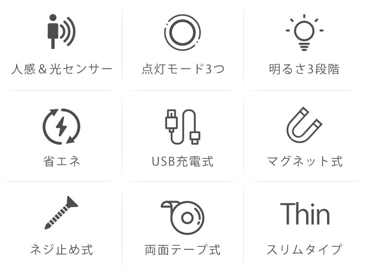 トイレに一個設置すれば、ドアを開くと自動点灯;トイレから出ると自動消灯するので、よくありがちな電気付け忘れ問題も心配なし。夜中に起きてトイレに行く際、または日当たりの良くない時にも活躍。