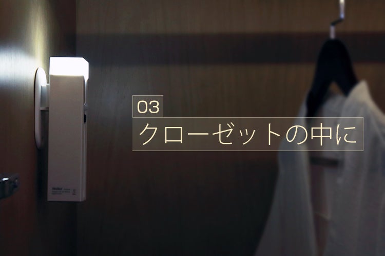 扉を開けると点灯するので、暗いクローゼットの中から、服や物を探すときに便利です。