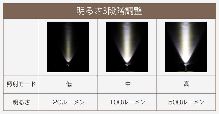 明るさは高・中・低の3モードを搭載、必要に応じて、自由に調整可能!