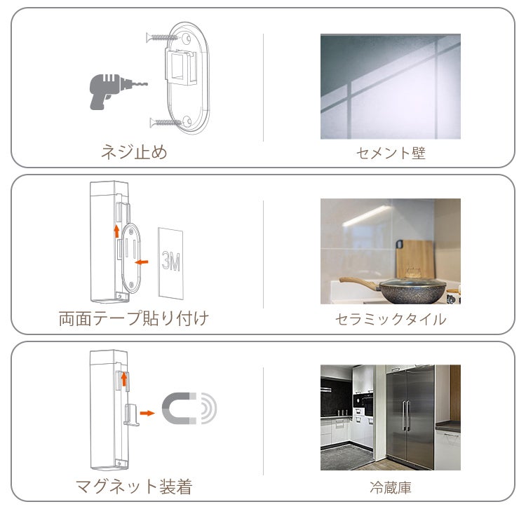 デコボコなセメント壁はネジで止め、木製家具やドア、セラミックタイル、ガラスのような平面は3M両面テープで貼り付け、冷蔵庫やキッチンなどのような金属平面はマグネットでピタッと簡単装着。場所をこだわず、好きなところに設置できます。