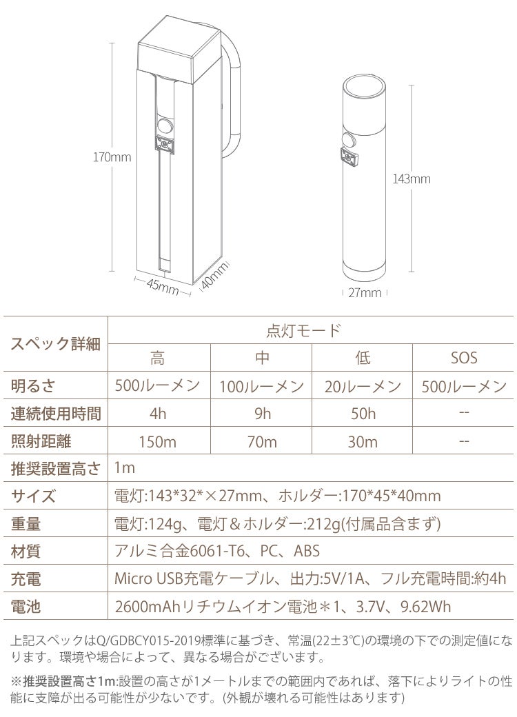 充電ホルダー付き、電灯をホルダーに差すだけで、簡単充電。充電方法が良くわからないお年寄りや子供でも困りません。
