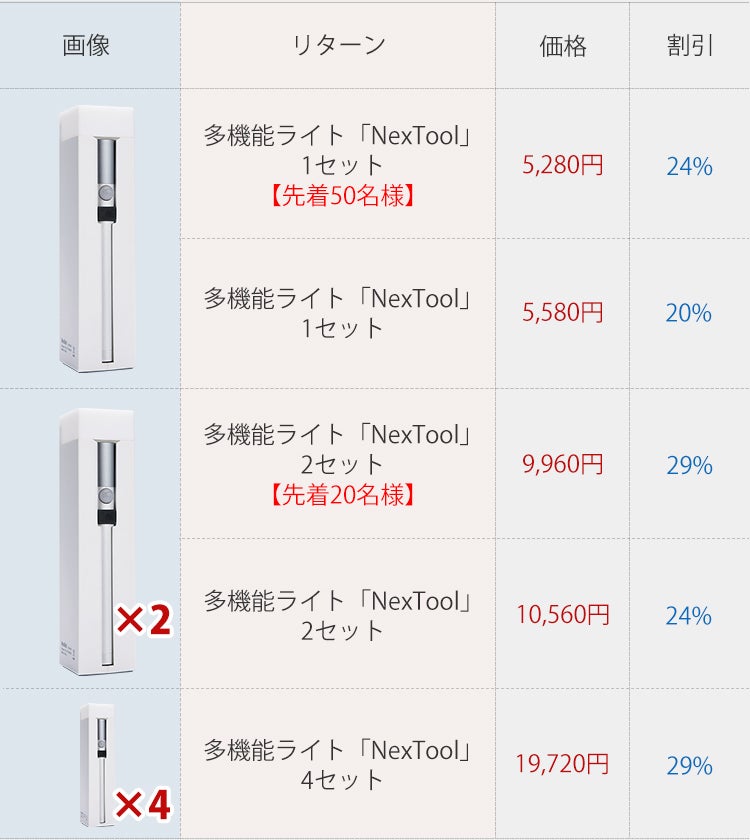 2020/07/09 09:52皆様こんにちは!雲集商事株式会社でございます。この度は多機能ライト「NexTool」にご関心・ご支援頂き、誠にありがとうございます。さて、6月4日(木)にスタートした本プロジェクトですが、募集終了日7/17(金)まで残りわずか8日となりました。今現在4名様からお力添えいただいたおかげで、支援額30,480円を達成しており、誠にありがとうございます。目標金額達成までには、まだまだ努力が必要ですが、雲集商事は諦めず最後まで頑張っていきたいと思います。是非皆様のお力をお借りして、SNSシェア等、商品拡散にもご協力いただけましたら幸いでございます。 残りわずか8日ではございますが、最後までどうぞよろしくお願いいたします。 もっと見る