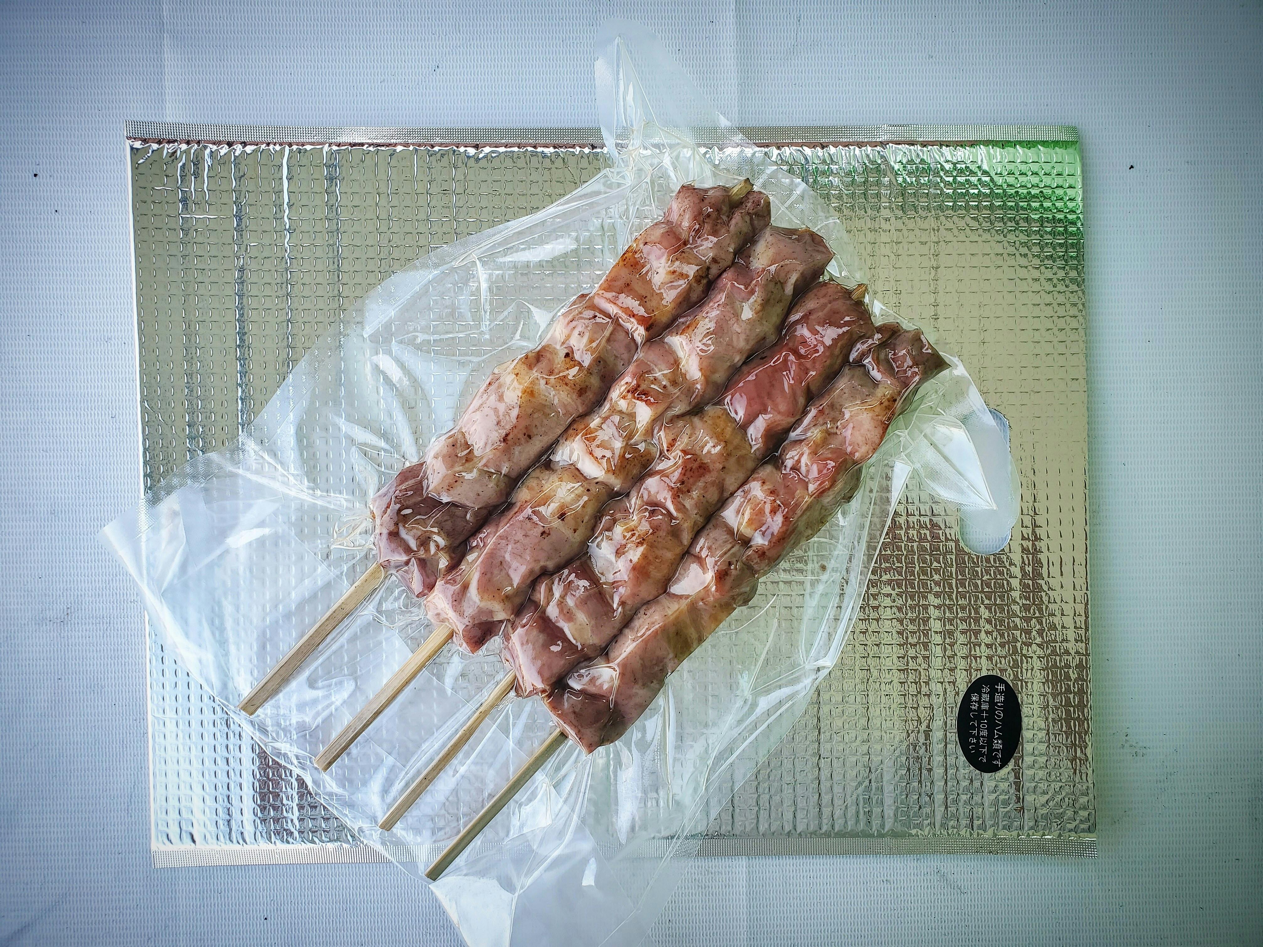 五浦ハムのハム焼は、手造りハムを串焼きにした一品。ハムの概念を覆すジューシーな食感と芳香な香りがやみつきになること間違いなし。原料は安心の国産豚肉100%です。2007年に商標登録、2011年にはその製法が発明と認められ、特許を取得いたしました。(特許第4874412号)