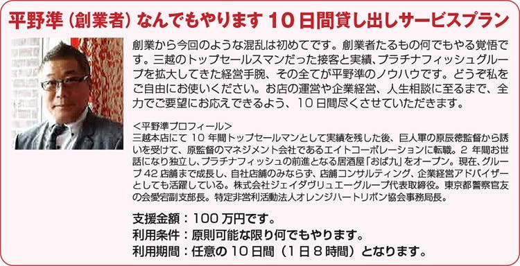 【4】「平野準(創業者)なんでもやります10日間貸し出しサービスプラン」で支援