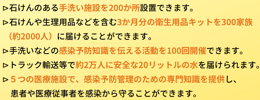医療体制の強化を図るため、石けん、消毒剤、薬、医療用マスク、防護服、毛布等の必要物資の支援を行います。