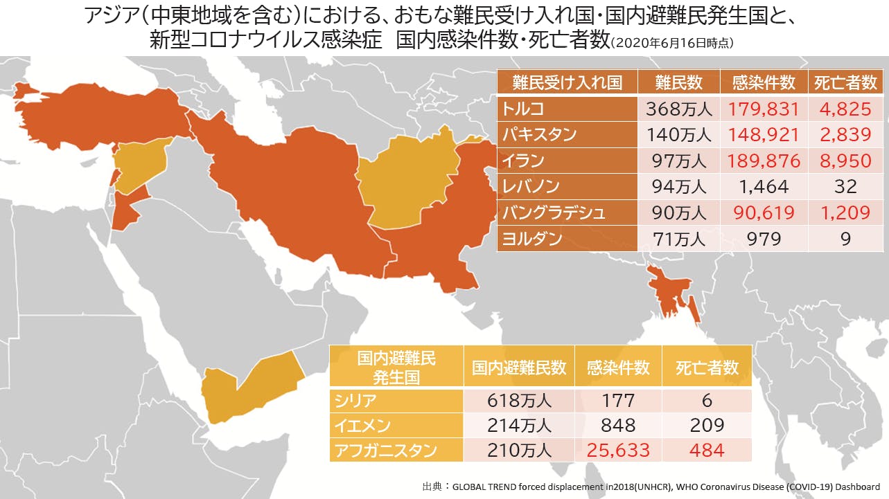 一方、中東地域では、シリアやなどからの多く難民を受け入れるトルコ、レバノン、ヨルダン等でも感染者、死亡者が発生しており、同国内の多くの難民キャンプも感染拡大防止のため、封鎖や移動の制限が行われています。