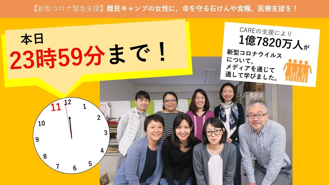2020/07/30 00:00感染の脅威にある難民キャンプの女性たちや困難な状況にある人々を支援するため6月19日から始めた新型コロナウイルス緊急支援クラウドファンディング。いよいよ本日が最終日となりました。23時59分の終了まで24時間を切りました 。これまでご支援、ご協力いただいた皆様に心より御礼申し上げます。本日は本クラウドファンディングを担当した、スタッフの神(じん)と、インターンの篠田より最後のお願いを投稿させていただきます。-----------------------------------------------------------------■インターン篠田より(スタッフ紹介記事はこちら)約一か月半の間、私たちの挑戦を応援してくださった皆様、誠にありがとうございます。お陰さまで、目標金額達成いたしました!私はジェンダーの問題は、特に日本では関心度が低いと思っていましたが、今回を通して、身近な人や多くの方がこの問題に関心を寄せていることが分かり大変うれしく思いました。私は難民キャンプの女性を紹介する中で、過酷な状況でも希望を持って生きている女性が世界中にいることを知り、恵まれた環境にいる自分はもっと彼女たちのためにも声を上げなくてはと奮い立たされました。コロナ禍により生計が立てられない、また暴力に悩む中でも、彼女たちは力強く生きています。このように支援を必要としている人はまだまだたくさんいます。目標金額は達成しましたが、皆さまからの支援が多ければ多いほど、多くの方を救うことができます。ぜひ、クラウドファンディング終了まで応援よろしくお願いします。■スタッフ神(じん)より(スタッフ紹介記事はこちら)いよいよ、あと24時間で終了です!長いようであっという間のこの1か月半、皆様の応援やメッセージの数々が本当に心強く支えとなりました。多くの皆様の、一歩一歩のご協力のつみかさねが、このように大きな支援となり、困難な状況にある人々に届けることができる、ということを身をもって知ることができました。心から御礼申し上げます。いったい「支援」とはなんだろうか、と考えることがあります。私たちは、今支援を届けているけれど、支援する側ー支援を受ける側という、二極的な考えは何か違うのではないかと思っています。普段、途上国に支援している私たち日本も、東日本大震災の時には、海外からたくさんの寄付やご支援が届きました。たとえば、イエメンのマラックちゃん(ストーリーはこちら)は、CAREから手洗いや感染予防策を教わりますが、支援を受けるにとどまらず、周囲に子どもたちにそれを教えてコミュニティの人々を支えようとしています。パレスチナの難民キャンプの女性たちも自らできることで力強く人々を支えようとしています(ストーリーはこちら)。支援するとは、一方通行の「助ける」ではなく、「助け合いの輪」をつくることなのではないかと思います。新型コロナウイルスは、これまでになかった世界共通の大きな課題です。移動の制限により、人と人が容易に交流できず、生きづらい状況の中で、それでも共に助け合うには、私たちは想像力をはらたかせ、心の距離を近づけ合うことが必要なのではないでしょうか。困難な状況にある難民キャンプの人々、女性たちのために、そして世界に「助け合いの輪」をつくるために、あなたも一歩をどうか踏み出していただけませんか。ご協力のほどお願い申し上げます。-----------------------------------------------------------------このコロナ禍は世界的に長期化することがわかっています。衛生環境の整備や、感染予防、衛生習慣の啓発を行うと同時に長期化するほど広がる経済的悪影響に対しての食糧配布、現金支給等の生活支援、また第二波、第三波に向けた医療体制への支援が必要になります。さらに、コロナの影響により、増大傾向にあるジェンダーに基づく暴力被害など、困難な状況におかれやすい女性たちの支援も切れ目なく行っていく必要があります。支援が一過性で終わることがないように。あと数時間ではありますが、さらなる支援を行えるよう、多くの方にこの活動を広めて頂きたく、引き続き、ご寄付ならびにシェア拡散などで応援いただければ大変うれしいです。「プロジェクトを支援する」から引き続き応援をよろしくお願いいたします! もっと見る