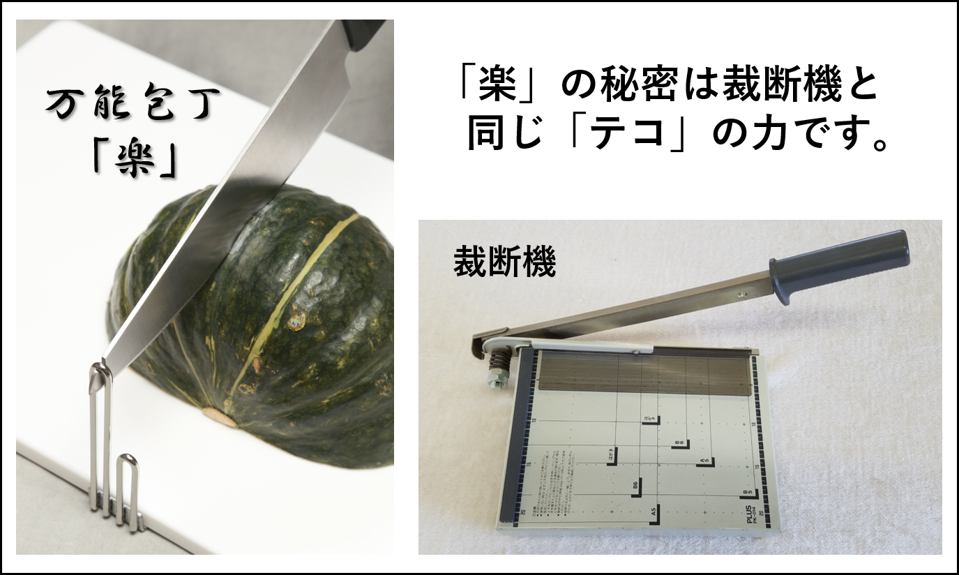 「楽」は硬い食材をテコの力で楽々切ることができる、革新的な万能包丁です。