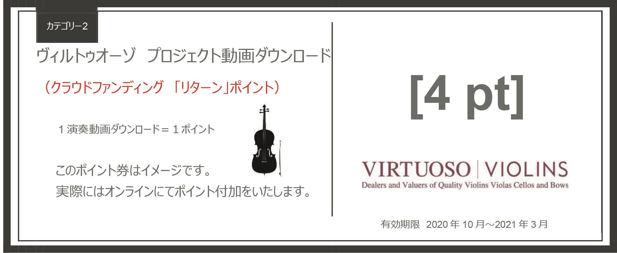 ヴィルトゥオーゾ動画提供サイトで1ポイント=1動画ダウンロードできるポイントを、支援金額に応じて付加させていただきます。高額支援の方には、ヴィルトゥオーゾで楽器・楽弓の購入、修理調整に使える商品券も混合させていただきます。付加価値のついたリターン内容となっておりますので、支援金額をお選びください。