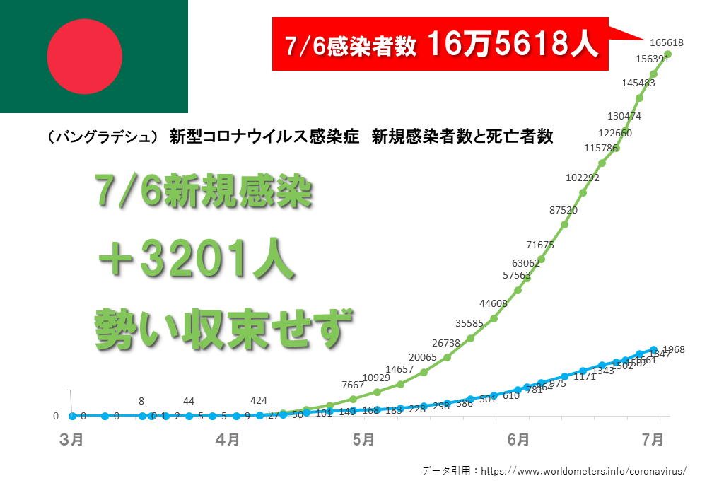 7月6日に新たに感染が確認された人数は、たった一日で3201名、外出規制の効果もみられない深刻な状況です。5月に襲来した大型サイクロンの傷跡も深く、人々は困難な状況に追い詰められています。