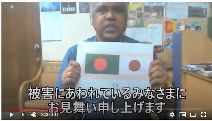 「As salamualikum(こんにちは)。似ている国旗を持ち、兄弟のような国であるバングラデシュからご挨拶申し上げます。私たちは日本のみなさんの愛とサポートを深く尊敬しています。