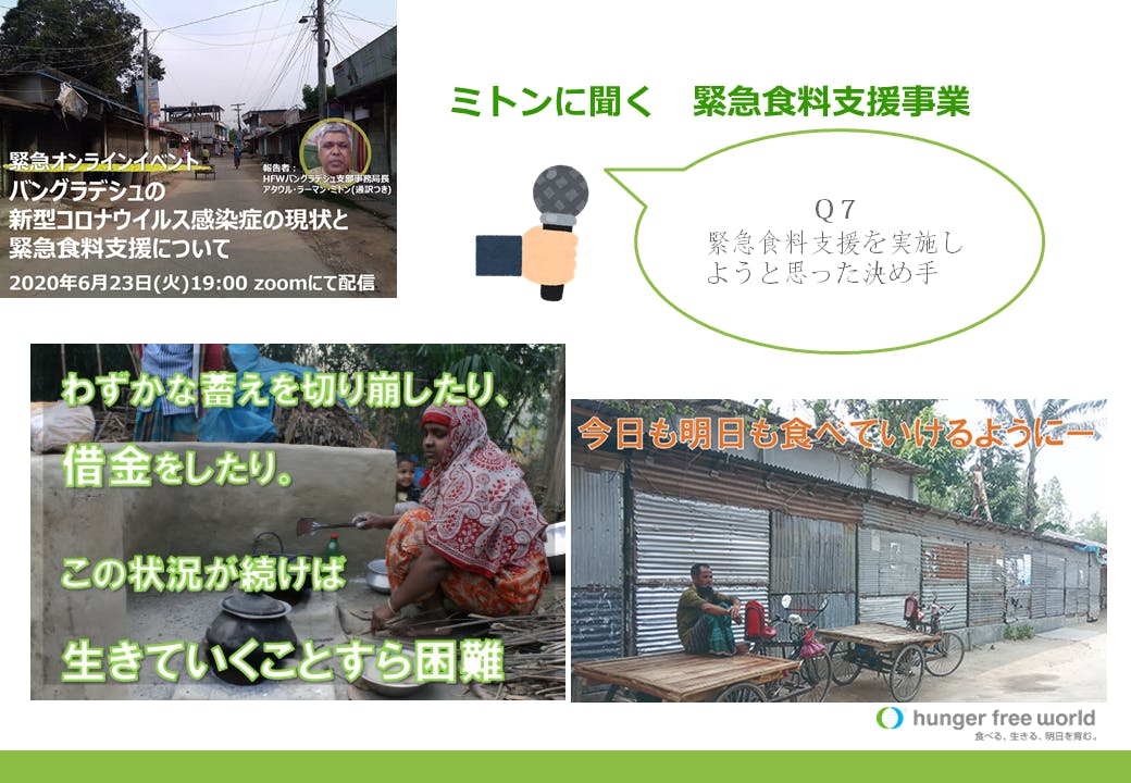 2020/07/04 14:116月23日(火)、バングラデシュのダッカ事務所からミトン支部事務局長が報告したバングラデシュのコロナ禍の現状とハンガー・フリー・ワールド(HFW)の緊急食料支援について2回に分けてご紹介している後編の今回は、HFW独自の緊急食料支援がどのように実施されたのか、困難や協力体制についてご紹介します。前編の記事は、こちらイベントの動画は、こちら*****新型コロナ感染症の感染拡大に伴い、3月25日から全国で外出自粛が要請されたバングラデシュでは、HFWバングラデシュの事務所も閉鎖しを余儀なくされました。その後、私たち職員は、村や支援対象の家族の状況に関する情報収集のため、「事業の推進者(LSP)」と呼んでいるこれまでHFWが能力強化を行ってきた住民たちと自宅から電話でほぼ毎日連絡を取り続けました。カリガンジとボダでは合わせて56人のLSPが(事業を実施している)同じ村(※)で活動しており、1人のLSPが12〜16人の支援対象の女性を担当しています。これまでもHFWは政府と連携しながらLSPの養成を行なってきており、学んだ知識をLSPは支援対象の女性たちに広げる、というように活動してきました。(※2021年11月:「同じ村 (same villages)」を「10ヵ村(ten villages)」と誤記していました。お詫びして訂正いたします。) 今回、HFW職員が事業地に直接行けない状況下で、支援の鍵となったのが支援対象者と同じ村に住んでいるLSPでした。LSPは支援対象者に多くのヒアリングを行なっています。例えば、カリガンジに暮らす女性、ファルハナさんの場合は、5人家族ですが、夫が障害を持っているために働けず 、彼女が大黒柱として農場で労働することで生計を立てていました。しかし、外出自粛によって、農場での仕事がなくなり、収入が途絶えました。お金を借りて、 家財道具を売り払い、わずかな貯金も使い果たしてしまったと教えてくれました。(追記※ファルファナさんの夫は全く働いていないわけではなく、持病を抱えながら公共交通機関(バス会社)でアシスタントとして不定期ながら、わずかな賃金は得ていました。)HFWは常に自立支援を行なってきた団体です。そのため、今回も当初は政府に対して、貧しい人たちへの緊急支援を要請しましたが、政府はNGOから支援を受けてきている人々を支援の対象から除外しました。この状況を見逃すことはできないと考え、バングラデシュ支部から本部へ支援の要請をし、今回の緊急支援が始動しました。そこで問題になるのが、外出自粛の要請が出ている中、安全に食料を支援対象の女性たちに配る方法です。HFWでは、感染予防と地域経済の活性化、村における支援活動の透明性の確保という3点を重視した結果、クーポンによる村の商店での食料配布という形になりました。まずHFWが発行したクーポンと感染予防のポイントを記したリーフレットを各LSPが担当している女性たちに配布します、そして、女性たちはHFWと提携している村の商店でクーポンと引き換えに食料(米20キロ、豆2キロ、食用油500ml)を受け取ります。村の商店は集まったクーポンをHFWに提出することで、支払いをうけることができるという仕組みです。多くの人が集まって密集環境を作らないよう、一斉配布は避けました。また、通常5〜10kmほど村から離れている市場でなく村の商店にしたのは、女性たちの移動距離を短くするためです。さらに、村の商店にお金が落ちることで、村の経済が活性化し、「どこで何を受け取っているのか」が他の村人にも明確になることで、支援の透明性を担保するため、村にある商店での引き渡しを採用しました。その後、外出自粛は徐々に解除されつつありますが、新型コロナ感染症は拡大していますし、ボダとカリガンジで仕事を失う人の数は増えており、食料の入手がさらに困難になっています。現在、HFWの事業も予定していたものではなく、新たな支援事業を展開しなければならないと考えています。例えば、これまで以上に啓発に力を入れ、基本的な感染予防の方法や、収入に頼らず、家庭菜園で自ら食料を作っていく方法などを貧しい人々に伝えていかなければなりませんし、最も貧しい人に支援が届くよう、政府への政策提言も強化します。さらに、HFWのボダ診療所を通して医療サービスを貧しい人々に提供したり、精神的なケアをする大切さも感じています。「新しい生活様式」の中で、私たちの事業計画も修正し、これから必要とされる支援を展開したいと考えています。そのために、皆さまからのサポートをいただければと、心からお願い申し上げます。*****************【参加者のみなさんの関心が強かった話題】●自分たちでは支援先に行かずリモートにて支援実施●国の支援が、ほとんど期待出来ない事。外国からの支援だけを期待しないで、国を変えていくことを、考えていくべき ●コミュニティでHFWの活動が周知されていたため、商店の協力が容易に取れたという話です。長い間、時間をかけてコミュニティと信頼関係を築いてきた