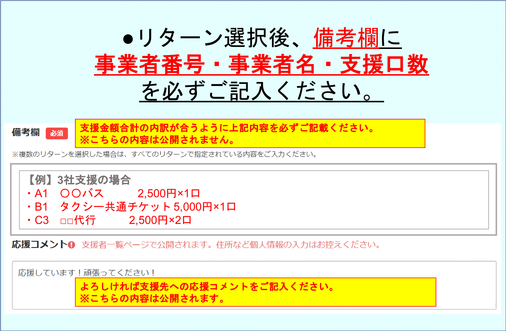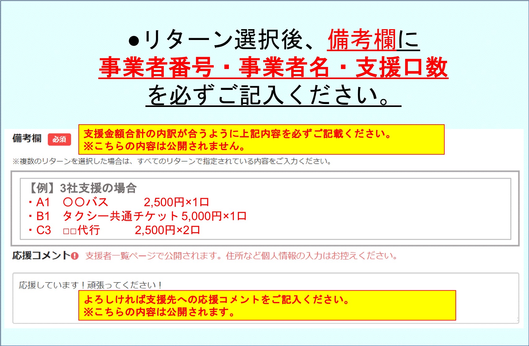 ※リターン購入画面で、チケットとは別に「上乗せ支援で応援しよう」に金額を入力された方は、備考欄に指定する【事業者番号】【事業者名】を記入ください。