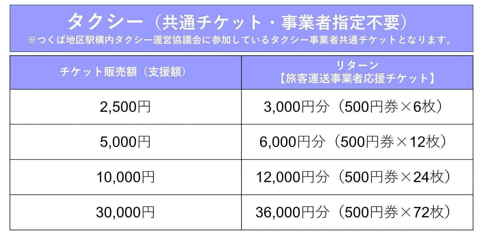 2020/07/03 17:35日頃よりご支援を賜りありがとうございます。今回は、「個別応援チケット」に参加するバス事業者を紹介いたします。支援者が指定するバス事業者の「応援チケット」を購入いただき、後日送付されるチケットを指定したバス事業者にてご利用いただけます。 購入者には、購入金額の2割を市が上乗せしたチケットを発行します。なお、個別応援チケット の種類・注意事項は、以下のとおりです。●路線バスは各社回数券を配布します。各社回数券は定期券の購入にもご利用いただけます。 ※1 A3:関鉄観光は180円と320円を組合わせた回数券となります。※路線バスは、事業者の営業管内であれば、市内発着、市外利用どちらでも利用できます。●貸切バスは以下のチケットを発行いたします。 【注意事項】※チケット利用による、つり銭のお返しはできません。※利用期間:2020年8月21日~2021年2月28日※応援チケットは以下の路線には使えません。・ICチャージ・高速バス・つくバス・筑波地区支線型バス・路線バス実証実験(茎崎地区)(桜地区)・コミュニティバス及び公的機関が関係する実証実験バスバス事業者は、以下のとおりです。<A1:植松自動車株式会社> 貸切バス住所:つくば市北条4359-3電話番号:事業者URL: http://www.uematsu-bus.com事業者から支援者へのメッセージ:オレンジ色のバスでお馴染みの植松自動車(株)です。創業以来、弊社は地域の皆様に支えられ、ともに歩んでまいりました。コロナ禍においても「安全・安心・快適」なご旅行を提供するために尽力いたします。<A2:株式会社上郷タクシー(貸切バス)> 貸切バス住所:つくば市上郷1264-1電話番号:事業者URL: http://kamigo-taxi.jp/事業者から支援者へのメッセージ:タクシー・貸切バスを営んでいる上郷タクシーです。コロナにより皆様も運営業も大変厳しい状況に置かれていると思われます。皆様に安心してご利用頂けるよう尽力してまいりますので、ご支援宜しくお願い致します。<A3:関鉄観光バス株式会社> 乗合バス/貸切バス住所:茨城県土浦市真鍋1-10-8電話番号:事業者URL: http://www.kantetsu.co.jp/kanbus/事業者から支援者へのメッセージ: 私ども、関鉄観光バスは茨城県を中心に観光バス事業(一部乗合バス)を展開しております。今般の新型コロナウイルスの影響で大変厳しい状況ですが、皆様に安全・安心なバスの旅を提供できることを心よりお待ちしております。観光バスのご用命は関鉄観光バスまで、よろしくお願い致します。事業者におけるチケット用途の制限:つくば市内の路線バスの運賃のお支払い、回数券、定期券の購入、また貸切バス運賃のお支払いの一部にご利用いただけます。<A4:関鉄グリーンバス株式会社> 乗合バス/貸切バス住所:茨城県石岡市行里川5番18号電話番号:事業者URL: https://kantetsu.co.jp/green-bus/index.html<A5:関鉄パープルバス株式会社> 乗合バス/貸切バス住所:茨城県下妻市下妻乙1274電話番号:事業者URL: https://kantetsu.co.jp/green-bus/index.html<A6:関東鉄道株式会社> 乗合バス住所:土浦市真鍋1-10-8電話番号:事業者URL: kantetsu.co.jp事業者から支援者へのメッセージ: バス車内の空調調整や換気、消毒の徹底、乗務員はマスクの着用及び健康衛生管理を行っておりますので、安心してご利用ください。どうか皆様の御支援をよろしくお願いいたします。事業者におけるチケット用途の制限:市内路線バスの運賃、回数券、定期券にご利用いただけます。<A7:ジェイアールバス関東株式会社> 乗合バス住所:東京都渋谷区代々木二丁目2番2号電話番号:事業者URL: http://www.jrbuskanto.co.jp事業者におけるチケット用途の制限:東京駅を発着する高速バスはご利用いただけません路線図<A8:株式会社大栄観光> 貸切バス住所:茨城県つくば市天久保1-12-7電話番号:事業者URL: http://www.daiei-kanko.co.jp/<A9:株式会社旅人> 貸切バス住所:茨城県つくば市沼崎2686電話番号:事業者URL:www.tabbit.co.jp■ご支援方法 ■備考欄記載の注意事項↓ご支援はこちらからお願いします! もっと見る【登録事業者紹介】個別応援チケット ジャンル:介護タクシー