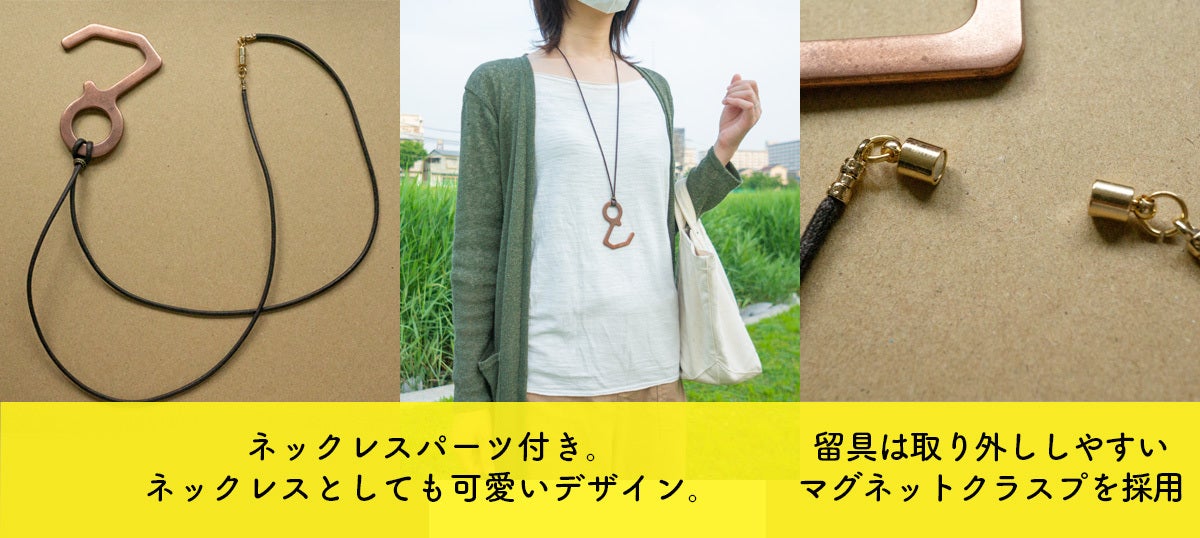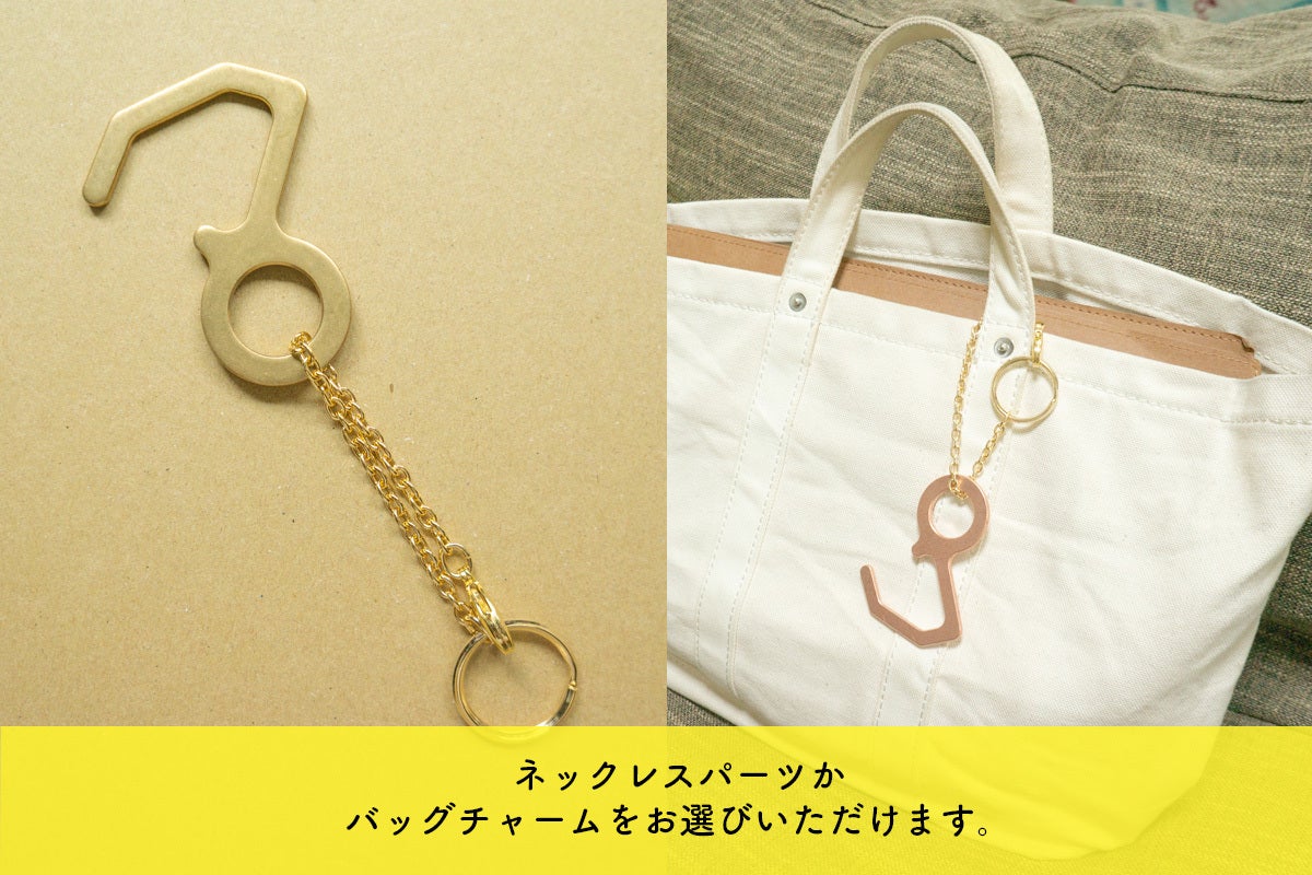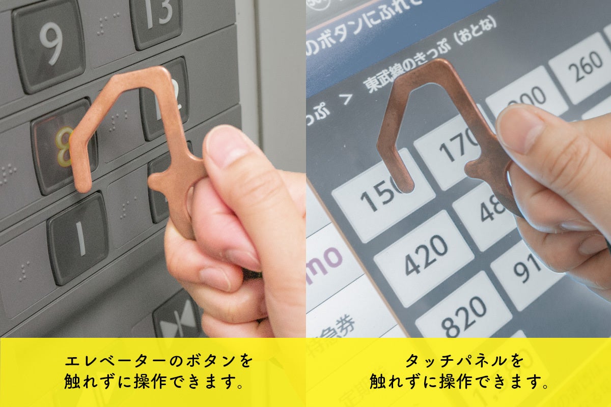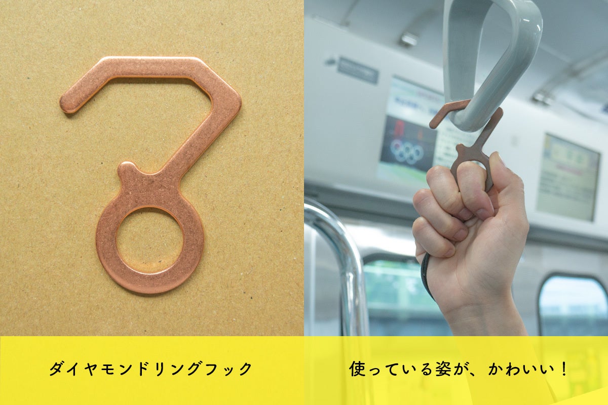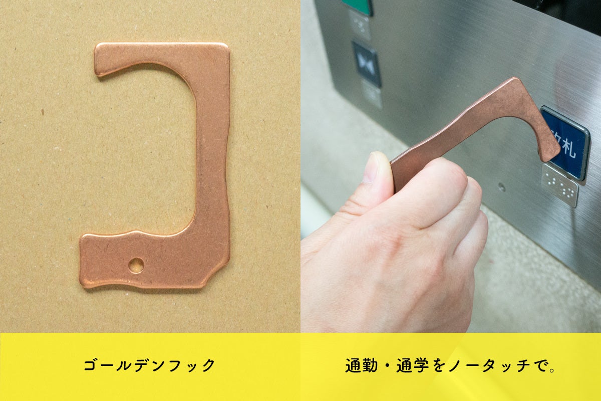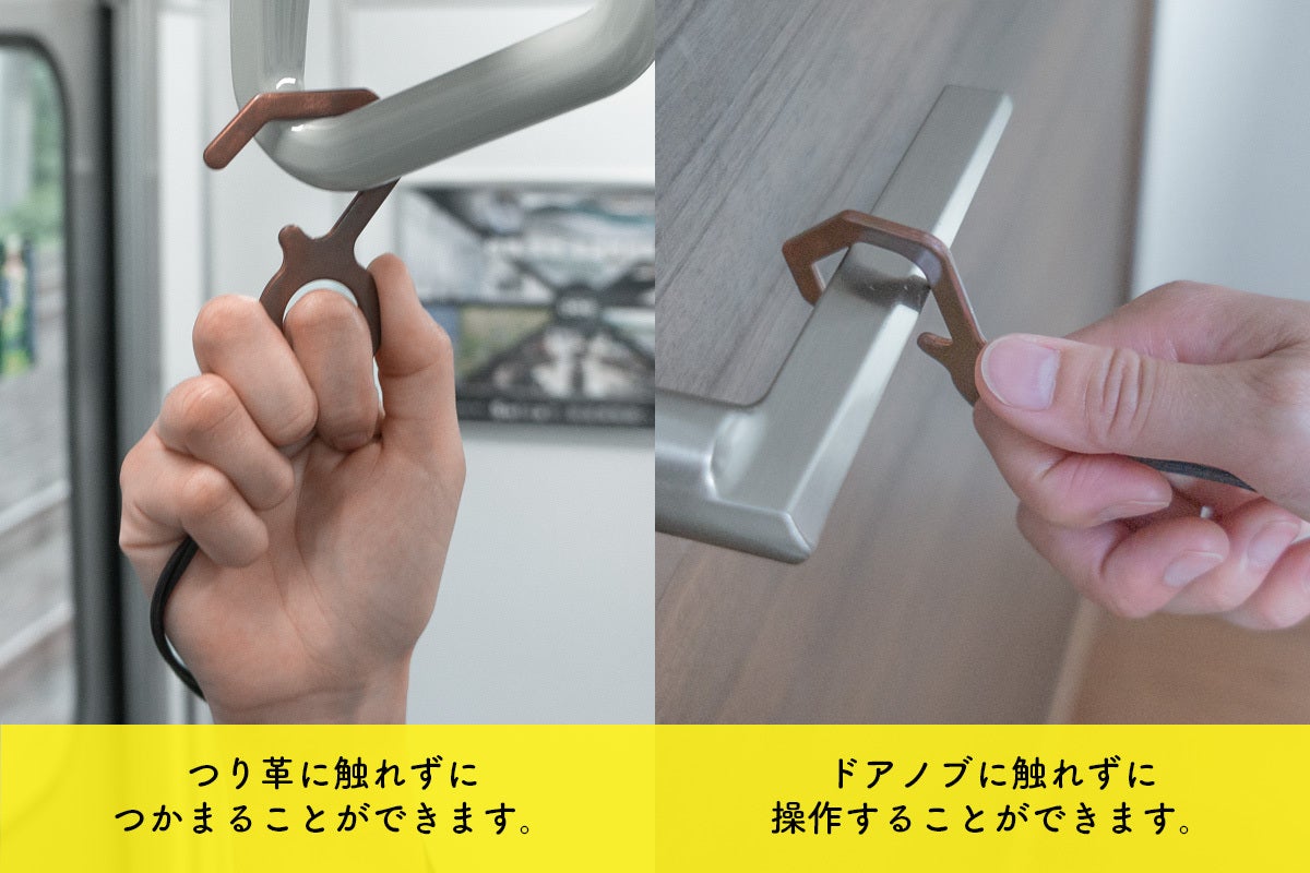 ・プロダクトは「防疫フック」です。つり革やドアノブ、エレベータのボタンなど不特定多数の方が触れる箇所への接触を防ぎます。