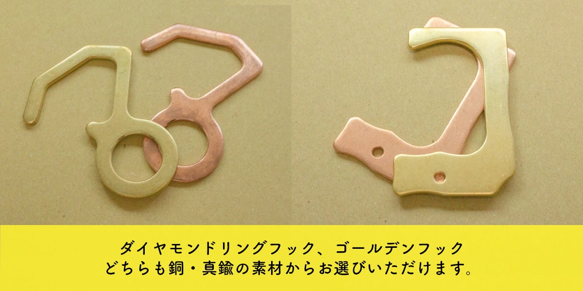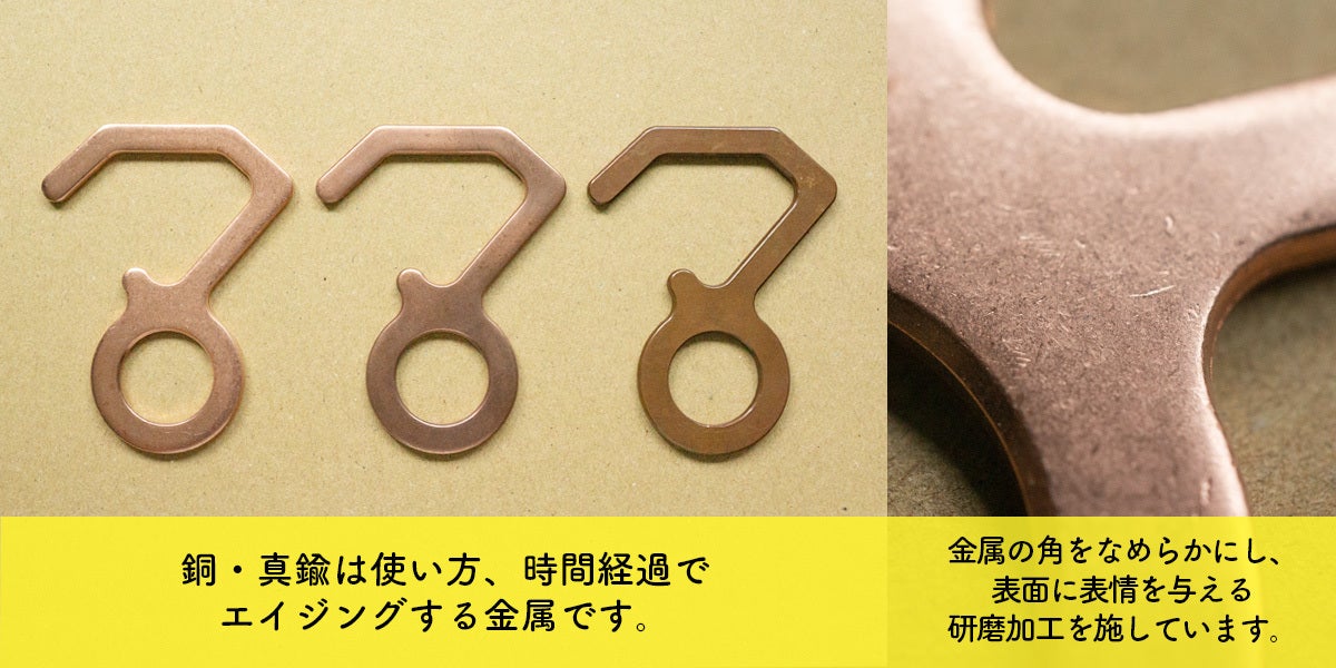 ・「ダイヤモンドリング」「ゴールデンフック」の材質である銅・真鍮はエイジングする、使う人によって表情を変えていく面白い金属です。その特性を活かし、アクセサリーや楽器、家具に使用されます。ぜひ、このエイジングを楽しんでいただければと思います。