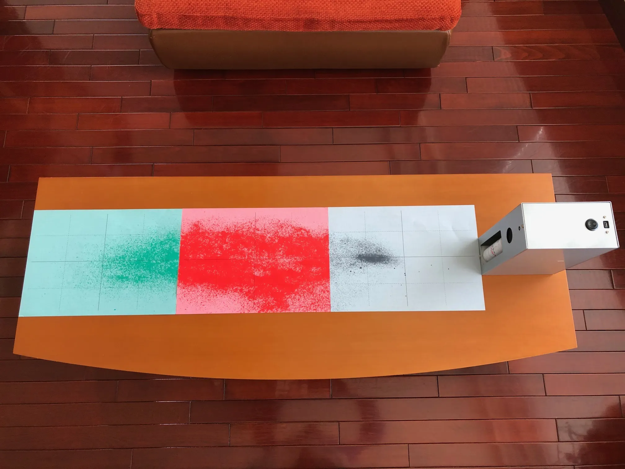 2020/07/08 16:40「マニャーdeシュ!」は「約1m水が飛びます 」と、水噴霧の距離については説明させて頂いておりますが、水噴霧の幅についてはお伝えしておりませんでした。今回、これを計測するために習字の練習に使う「水書き用紙」を使用しました。水に濡れると色が変わる紙です。これをテーブルの上に並べてから「マニャーdeシュ!」から水を噴霧させました。上の写真で、装置の端からテーブルの端までおよそ1mとなります。結果を見ると最も幅が広がるのは50cm付近ということが分かりました。噴霧の最大幅は20cmほどになりました。ご参考にして頂けましたら幸いです。 もっと見る