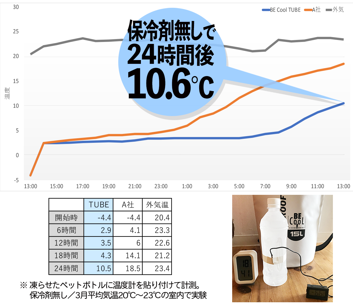 TUBEの保冷時間の変化を、一般的なファスナータイプの保冷保温ソフトバッグと比べてみました。