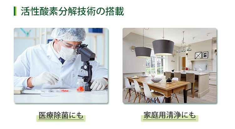 その原理を活かした活性酸素分解技術を搭載し、より効果的なホルムアルデヒド除去が可能に。活性酸素分解技術は、医療除菌や家庭用ホルムアルデヒドの除去にも実際に採用されているので安全面でもとても安心です。