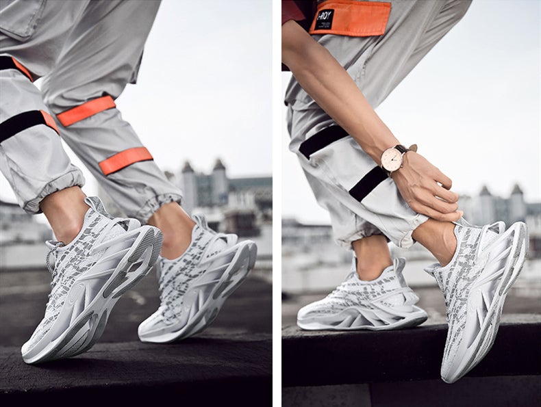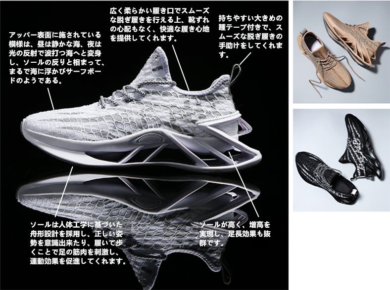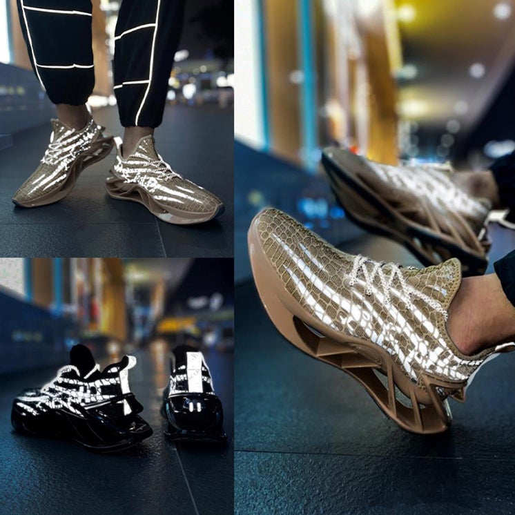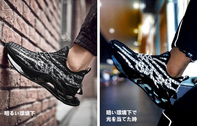 アッパー、シューレース(靴紐)は伸縮性に優れるリフレクター素材を表面に施し、光を反射することで、車や自転車からの視認性が高くなり、夜間走行の安全性が格段にアップします。