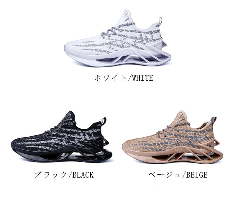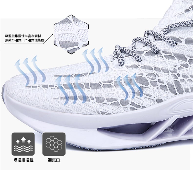 アッパーは通気性のよいメッシュ素材を採用し、無数の通気口から汗を素早く外部に蒸発させ、蒸れを防ぎ、常に快適なはき心地を提供してくれます。