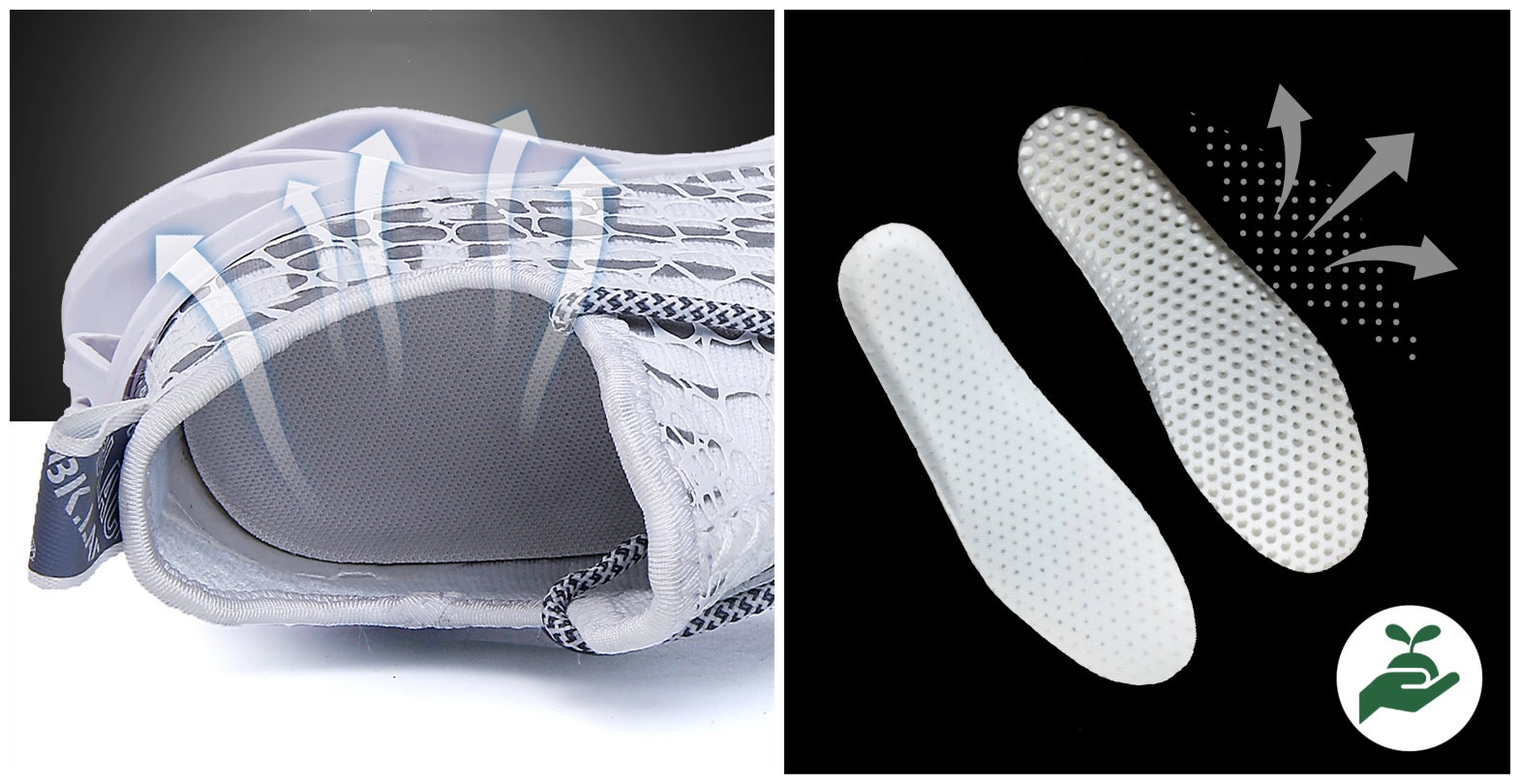 インソールは軽く、弾力のあるEVA素材を採用しています。インソール全体に無数の小さな通気口を開けることで、素早く熱を外に逃がし、靴内部に熱がこもるのを防いでくれます。またEVA素材は燃やしても有害物質を発生しないので、環境にも優しいエコな素材です。