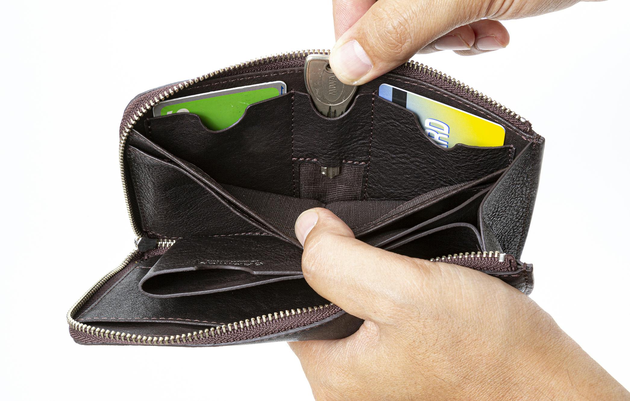 現金やカードの出し入れが楽。レジでもたつくことがなくなった。わりと大きめの鍵も入るし、銀行通帳やパスポートも入る。出張時にはチケットとパスポートを入れて機内に持ち込めそう。