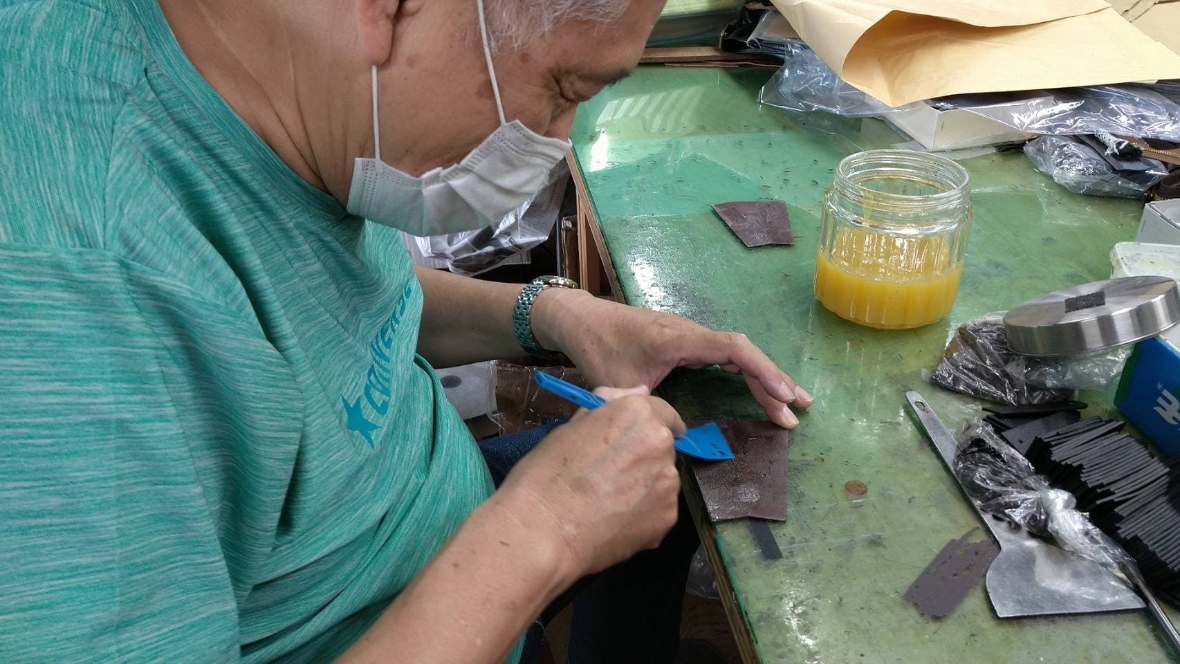 2020/08/27 17:00サポーターの皆様、こんにちは!プロジェクト受付終了からはや1ヶ月経ちましたが、変わらずお元気でしたかー??工房は今日も元気に稼働中!ハイブリッドウォレットの製作も順調に進んでおりますよ♪▲<写真> 今日はちょっと可愛いめTシャツをお召しの巨匠・福田さん何やら糊をぬりぬりなさってます。え??机の上に「おかしな物」があるって?流石!よくお気付きですね!!そうです!ソレですソレ!!「お好み焼きのコテ」ちなみに何に使われる道具だと思いますか?・・・・・・・・・・・・正解は、広範囲に糊を塗る時に使う道具だそうです!!なるほど!でっかいカバン作る時とかに活躍するんですね。まさかカバンを作るのにお好み焼きのコテが必要だったなんて思いもしなかったですよね。職人さんの間では結構「あるある」らしいです(笑)なんかお好み焼きが食べたくなりましたね(笑)ちょっとした小ネタでした。坂本ラヂヲ 城戸 もっと見る