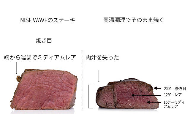 Nise Waveは通常の調理の過加熱や不均一な加熱の問題を解決してくれます。端から端まで全く同じ焼き具合なのに対し 、加熱により水温を0から99°Cまでの任意の温度に保つことができます。火加減の心配もなく、放っておくだけでなめらかに口の中で溶けるステーキに仕上げます!