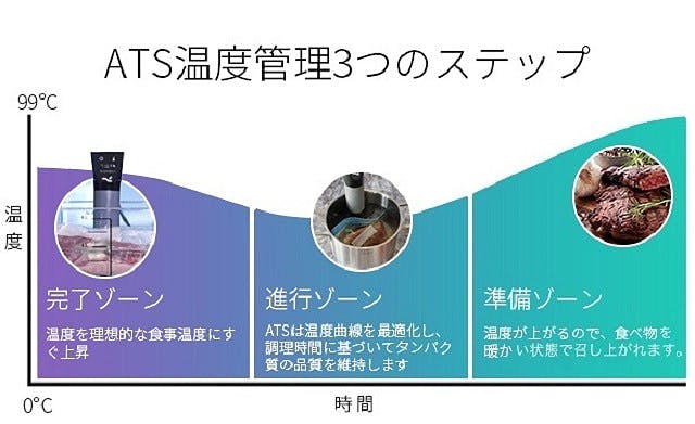 市販されている低温調理器の多くは設定水温に達すると、温度センサーがプログラムに加熱停止の指示を下します。しかし、加熱停止動作の間も加熱しているため、最終的には設定された温度を超えてしまい、お肉の食味に影響を与えています。
