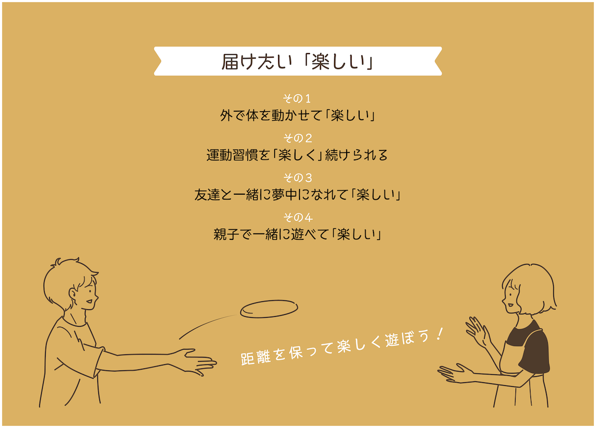スポーツという言葉は、気晴らしや気分転換といった意味を持っています。仕事や家事などの「日々の生活」から離れる時間を作り、前向きな気持ちを生み出すことがスポーツの本質であり、人生を楽しむための効果的なツールです。人との物理的距離を維持しながら、年代性別等を問わず、すぐに「楽しい」という感情を生み出せるフライングディスクを日本中に届けることで、運動習慣や人との交流を再開する後押しをしたいと考えています。