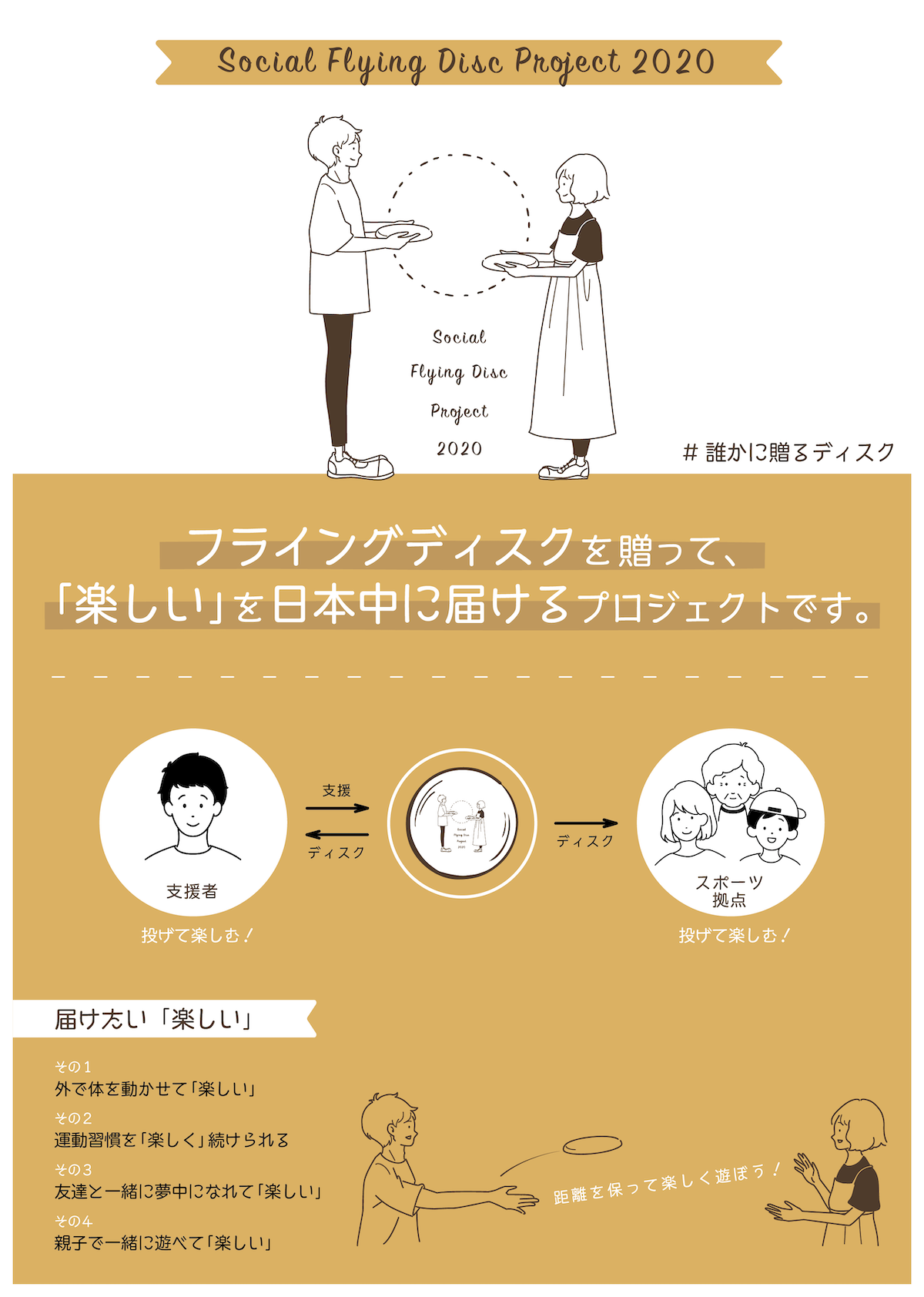 フライングディスクは魔法の円盤です。発明されてから70年以上に渡り、世界中の人々を繋げてきました。人との距離が必要になっている社会情勢だからこそ、人を繋ぐフライングディスクの可能性を再確認する活動が、今回のプロジェクトです。