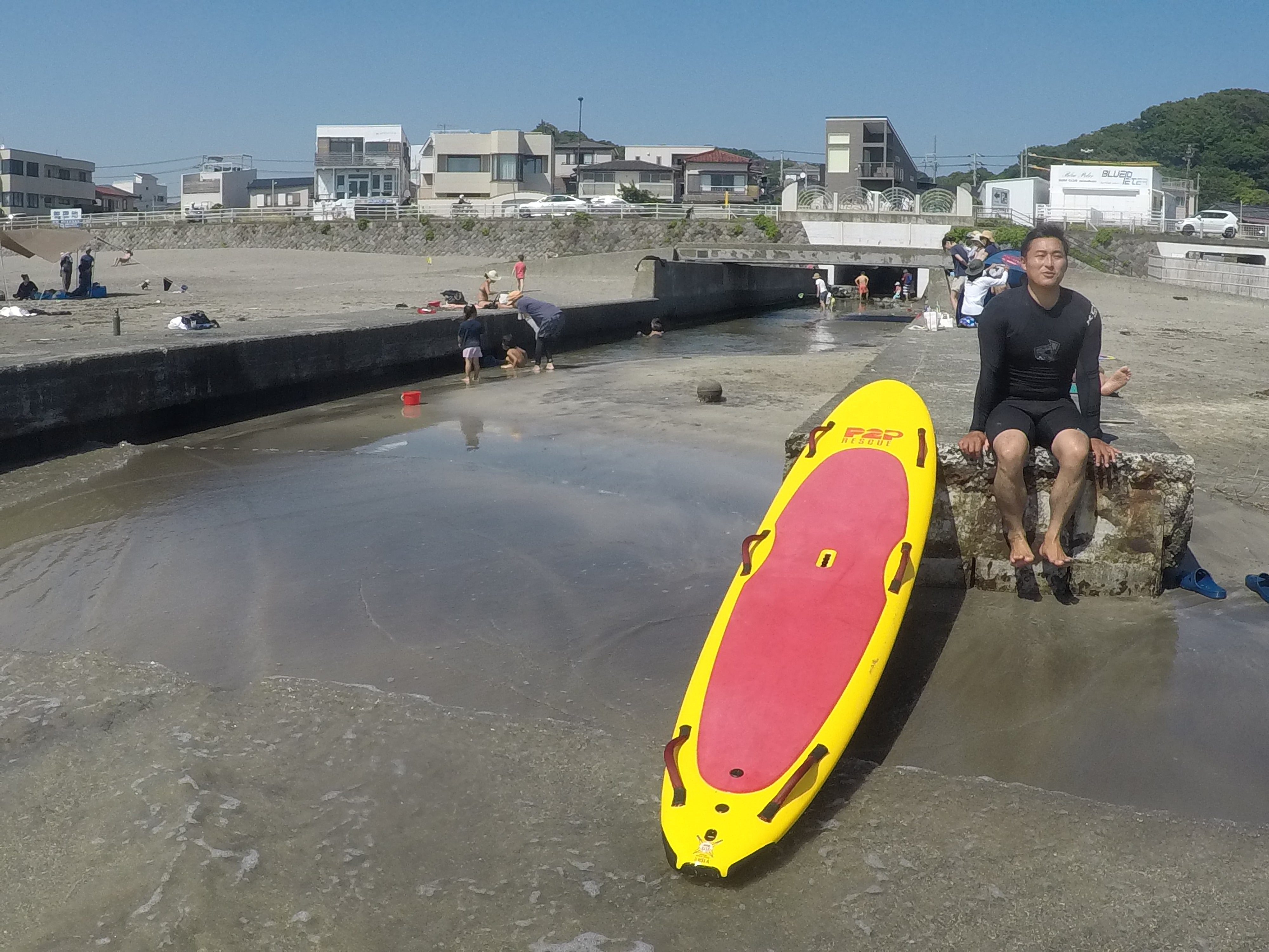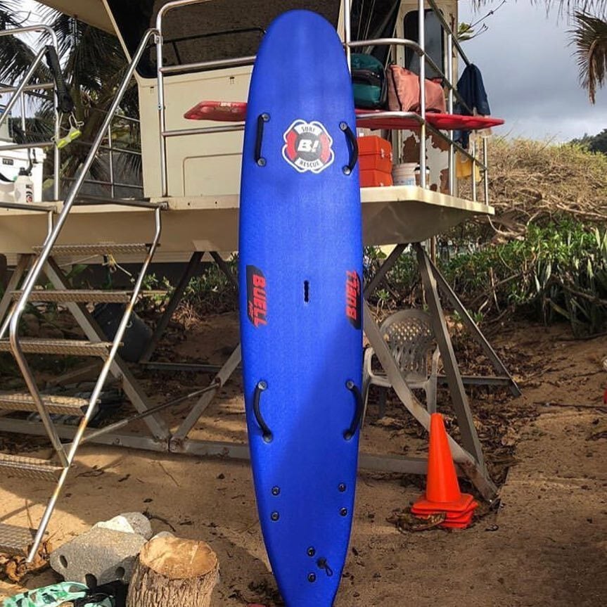 これ、ソフト素材で作られた、普通のロングボードよりも大ぶり(10ft)のサーフボードです。普通のボードより浮力があるので、二人乗ってパドルすることもでます。ライフガードが用いる専用のレスキューボードのように、ハンドルも付いてます。