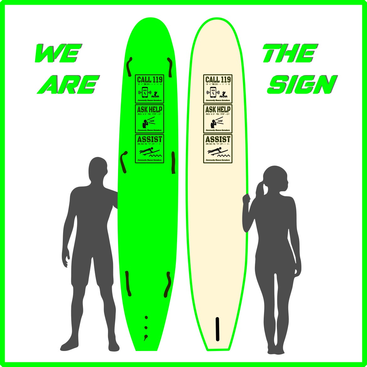 もし、水中でトラブルに陥った場合、周りで気づいた人たちが、すぐに通報し、最低限のサポートをする際にも、このボードを活かせるようになるのが理想です。ボードにプリントされたサインは、こういった緊急時の初動を、簡潔に表現しています。