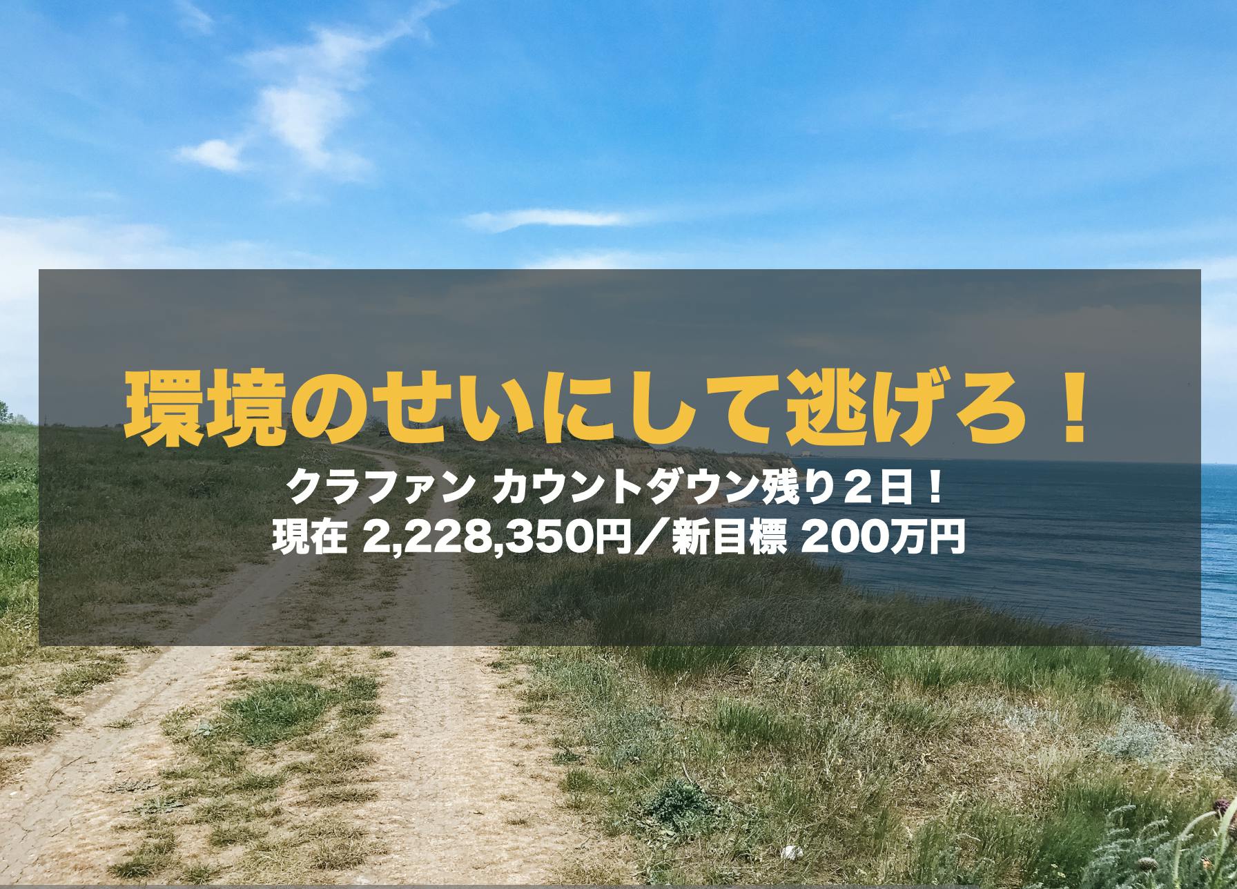 2020/07/26 20:39クラファン カウントダウン残り2日!現在 2,228,350円/新目標 200万円(祝!ネクストゴール達成!!)クロスロードのタクです。いよいよクラウドファンディングの残りの期間も2日なりました!引き続きご支援も途絶えることなく、有り難いことに頂いています。ありがとうございます!この活動報告記事も残り3回ほどになりますが、最後までよろしくおねがいします。さて、コロナウイルスによるセブのクロスロード一時休校により、2児の職なしおやじになって4ヶ月。これまで災害や大きな病気や怪我に見舞われることなど実は想像すらしていませんでした。時折、起きる災害や不幸な事故も、恥ずかしながら、どこか遠くの国の話のように感じていました。でも、コロナウイルスに感染したわけではないのの、こうして災害(コロナなので疫病)で大きなダメージを受ける側になって初めて、自分もこういった災難の当事者になり得るのだということを実感し、被害者、弱者の気持ちを感じることができたと思います。環境のせいにして、助けを求めることを躊躇しない先日、友人でクロスロードのボランティアスタッフをやってくれたり、今回のクラウドファンディング、コミュニティでもお世話になっているおすぎさんのワークショップに出席させていただきました。おすぎさんは元々、精神疾患者に対するメンタルケアのお仕事をされていた方です。今回のワークショップはその方法を健常者が目標達成をするために応用する内容でした。ワークショップの内容をまとめると、「目標達成を阻害している要因を環境のせいにして、自分を必要以上に責めない。そして自分の持っているリソースに目を向けよう!また自分の弱みですらリソース(強み)になり得る」というのが大切なメッセージで、それらを順番に「言語化していく」というものです。この僕にとっては「目標達成を阻害している要因を環境のせいにする」というのがとても新しくて新鮮に感じました。僕らは「自責」の立場を取ることを当然と思い込んでいる僕らは上手く行かない場合は、自分の中に原因を見出し自らを変えることで問題を解決するように求められてきました。「他人や環境は変えることができない、変えることはできるのは自分だけである」というのがその論拠だと思います。でも、これってある意味、強者の論理なのだと思います。強者のおごりだと捉えても良いかもしれません。むしろ、「少なくともその時点の自分としては100%やっていたのだ。しかし、周りの環境のせいで上手く行かなかったのだ」という地点からスタートしても良いのかもしれないなぁと感じました。そうすることで、自分を必要以上に責め過ぎずにいられます。僕らは、心に重荷を背負ったまま長く頑張り続けることはできないし、それは幸せへの道ではないように感じました。全てを自分で背負い込まず、頑張りすぎず、人に助けを求めるやりかたもあるのではないのでしょうか?過去そして今の自分に対して「頑張っている(いた)じゃん!」と認めるところからスタートしても良いのではないでしょうか?僕は一人で頑張り過ぎず、周りに頼ることにしましたコロナ禍の影響を受けてセブを追われた僕ら家族は、現在愛知県の僕の実家の両親の家にお世話になっています。また、今回のクラウドファンディングでは、多くの人々にご支援をいただきました。スタッフの皆には助けられてばかりですし、今作っているコミュニティも多くの人に頼ろうとしています。もちろん、僕に出来ることは全てやるつもりでいます。でも、僕は今回の出来事は全て自分のせいではないし、自分で背負いすぎないようにして、周りに助けを求めようと決めました。そうすることで、肩の荷がおりてとても気持ちが楽になったと思います。最後までやりきることが「善」で、逃げることは「悪」って本当?今、世の中は画一的な成功を求めるのではなく、自分らしく生きていくことが重要視されるようになってきたと感じます。それって、ある意味、自分らくないやり方や環境から「逃げること」からスタートするのかもしれません。僕の世代は『最後までやりきることが「善」、逃げることは「悪」』と教えられてきました。でも、逃げたその先で、成功や自分らしい生き方を掴む人を僕は数たくさん見てきました。むしろ、自分に全く適性のない環境で、最後までやりきろうと頑張っている人こそ、活躍できない世の中になってきたのではないでしょうか?もちろん、人によっては、「環境のせいにしたところで、頼る人や助けてくれる人などいない」と感じる人もいるかもしれません。確かに子育てや大切な人間関係のように簡単には逃げられないこともあると思います。でも、その場合であっても、自分だけで背負い込まずに誰かに助けを求めることは本当にできないのでしょうか?今時々起こる不幸な事件も、上手く人に頼るすべを知っていたら防げたものは数多くあると僕は感じていま