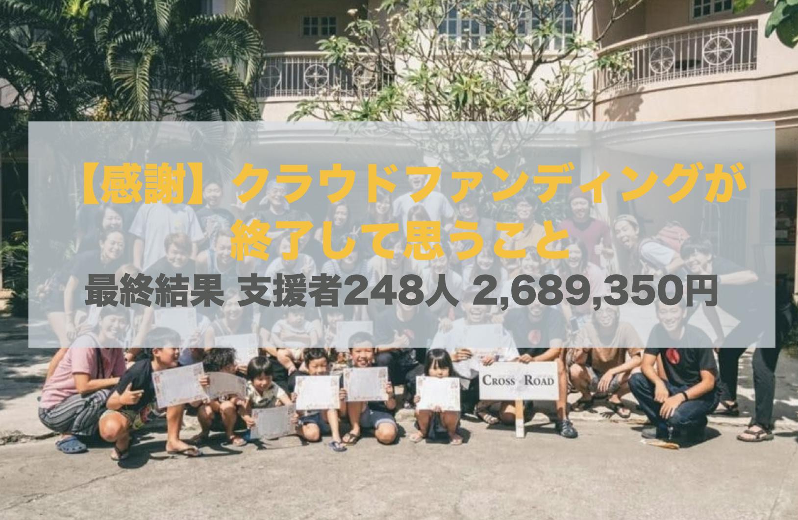 2020/07/30 06:00クラファン カウントダウン無事終了!現在 2,689,350円/新目標 200万円(祝!ネクストゴール達成!!)クロスロードのタクです。昨日の夜中の12時をもって、クラウドファンディングが無事終了しました。多くの皆さんにご協力をいただきまして、本当にありがとうございました。最終的な数字は、以下のとおりです。支援者数…248人支援総額…2,689,350円当初目標額…1,500,000円達成率…179%今回、ご支援をいただいた支援金を元に良いオンライン英会話スクールを皆で協力して作っていきたいと思います。多くの方にご支援をいただけたこと、資金的な目処が立ちスタートラインに無事に立つことができたことに対して、有り難いという思いと同時に安堵の気持ちが湧きました。かなりタイトなスケジュールの中準備をしていますが、皆さんから頂いた激励の言葉がとてもうれしく、僕を含めたスタッフの励みになりました。いただいたご支援のリターン及び個別のお礼のメッセージは随時送らせていただきたいと思います。ただ、学校とコミュニティの準備を進めている中ですので少し遅れてしまいそうです。少々お時間をいただけますと幸いです。本当にごめんなさい!28日間のクラウドファンディングが終了してみて思うところは、いかに自分たちが多くの方々に支えられているか、ということです。そして、そんな自分たちがいかに恵まれているかということも再認識することができました。これまで進んできた道が間違いではなかったとも感じることができたことも本当に良かったです。今回のコロナウイルスの影響について、幸いにも僕の周りの人達の大きな健康上の被害は出ていませんが、僕たちのビジネスや生活は大きな影響を受けてしまいました。これまで災害や戦争、大きな怪我や病気が自分たちの身に降りかかることは想像はできても、正直、実感することはありませんでした。しかし今回、自分たちのやってきたことや生活が一変してしまうことが起きて、僕らは儚さと不確実性の中を生きていて、目の前の現実というのはいつでも壊れ得るものなんだと感じました。だからこそ今目の前にあるものを大切にしていかないと、ですね。今後ですが、宣言したとおりオンライン英会話スクールとオンラインコミュニティの立ち上げを行っていきます。スケジュール的には当初思い描いていたものよりも若干遅れてしまっていますが、必ず良いものにしていきたいと思います。クラウドファンディングにご支援頂いた方については、当初の予定通り8月1日よりサービスを提供させていただければと思います。また、一般の方へのサービス開始は2週間ほど遅れて、8月の中旬になる予定です。クラウドファンディングが終了して、一息入れたい気持ちもありますが、ここからが始まりであり、今はスタートラインです。多くの方にご支援をいただけたという、この圧倒的に恵まれた環境に感謝をしながらも気を引き締めて前を向いて進んでいきたいと思います。昨晩、久しぶりにセブにいるクロスロードのヘッドティーチャーのJerahとFayeとオンラインで話をしました。二人共変わらず元気で、ちょっと「太ったわぁ」と笑っていました。セブは依然感染者が多く出ていて大変だと思います。もちろん心配していましたが、変わらない笑顔を見ると何だかちょっとほっとしますね。この記事を執筆しているのは、7月30日の早朝になります。きっと今日も忙しくなりそうです。今日もやり切ったと思える良い1日できるといいな。今回のクラウドファンディング、本当にありがとうございました! もっと見る